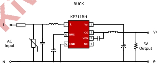 輸入電源:輸入電源通過變壓器的初級繞組連接到 KP311BHWG 的輸入端,為芯片提供工作電壓。
