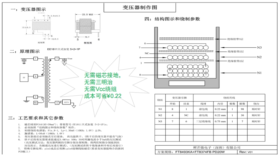 在成本控制方面,FT8493KA表現出色。其變壓器設計采用了三個繞組,無需磁芯接地、VCC繞組和三明治結構,降低了材料成本和制造復雜度,成本可節省約0.22元。同時,高集成度的BOM清單減少了額外元件的使用,如無需起機電阻、Rcs電阻和VCC二極管等,進一步降低了成本,節省約0.08元。這種成本優化的設計,在保證性能的同時,為制造商提供了更具競爭力的解決方案。