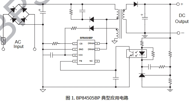 BP84505P的輸入端通常連接到交流電源,通過整流橋將其轉換為直流電壓,為后續的電路提供穩定的輸入。輸入電壓范圍通常為90V~264V,能夠適應不同地區的電網電壓波動,確保設備在全球范圍內都能正常工作。在輸入端還配備有過壓保護(OVP)和欠壓保護(UVLO)功能,當輸入電壓超過或低于設定閾值時,芯片將自動關閉輸出,保護電路免受損壞。