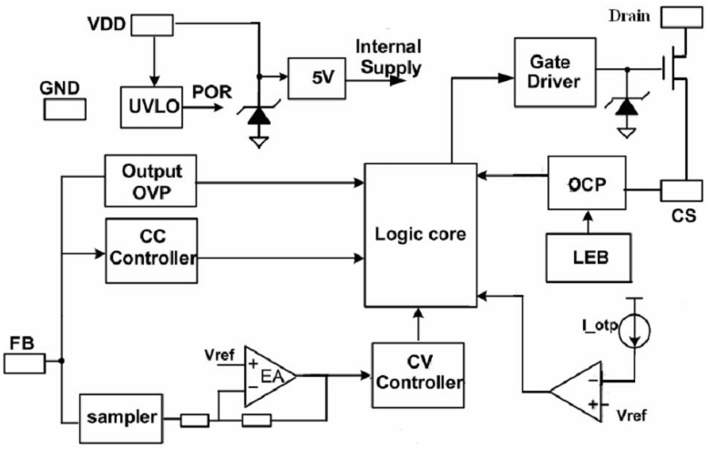 兩款芯片在其他電氣參數上基本一致,包括啟動電流、工作電流、欠壓保護閾值、過壓保護閾值等。這表明它們在基本的電氣性能上具有高度的兼容性,能夠滿足相同的應用需求。內部框架圖如下所示