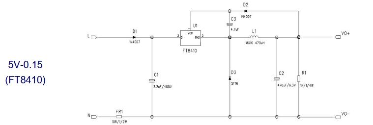 FT8410是一款輸出電壓為5V、輸出電流為0.15A的AC-DC恒壓芯片。其典型電路如下圖所示: