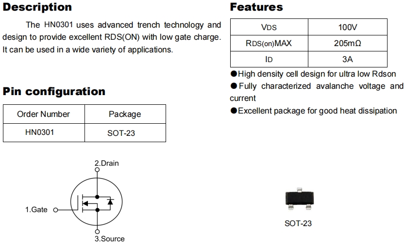 在 60 W 以下的開(kāi)關(guān)電源、馬達(dá)驅(qū)動(dòng)或電池保護(hù)板上,工程師往往希望找到一顆“既耐壓又高開(kāi)關(guān)速度、同時(shí)封裝足夠小”的 MOSFET。華能(HN)推出的 HN0301 把 100 V 耐壓、205 mΩ 低導(dǎo)通電阻和 3 A 連續(xù)電流塞進(jìn)了一顆 SOT-23 三腳小封裝,成為 24 V 工業(yè)母線(xiàn)、12 V/24 V 汽車(chē)周邊、POE 受電設(shè)備等場(chǎng)景的新寵。本文結(jié)合原廠數(shù)據(jù)表與實(shí)測(cè)筆記,帶你1分鐘吃透這顆“迷你功率管”。