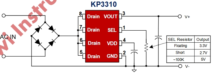 AC→保險絲→整流橋→22μF/400V→KP3310SGA→47μF/10V→5V/30mA