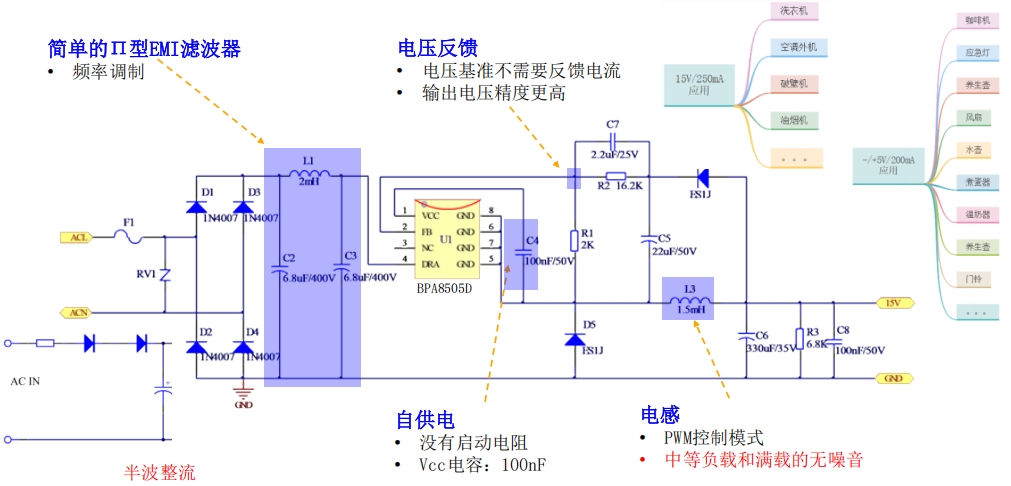 BPA8505/BPA8506系列是晶豐明源針對小功率非隔離電源市場推出的高性價比方案,通過內置650V高壓MOS、極簡外圍、智能多模式控制,實現了125mA~450mA輸出范圍的完整覆蓋。相比傳統阻容降壓方案,具有效率高、待機功耗低、安全性好的顯著優勢;相比外置MOS的Buck方案,又具有成本低、體積小、設計簡單的特點。