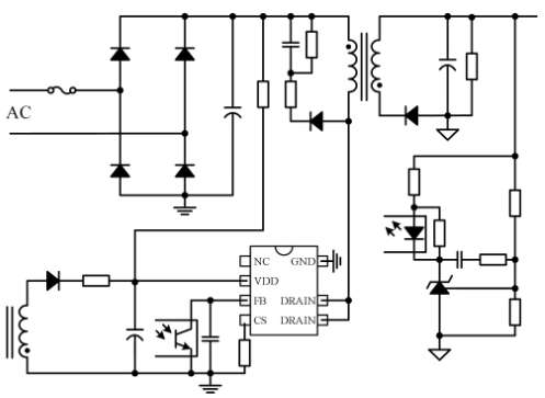 芯片通過對輸出采樣并反饋到光耦獲得高精度的恒壓輸出。內(nèi)置的斜率補償電路確保了峰值電流模控制的穩(wěn)定性。內(nèi)部集成的頻率抖動功能可以改善EMC,降低EMI濾波成本。