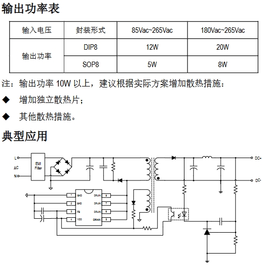 輸出功率 DIP8 ,(85Vac~265Vac)12W; (180Vac~265Vac)24W
