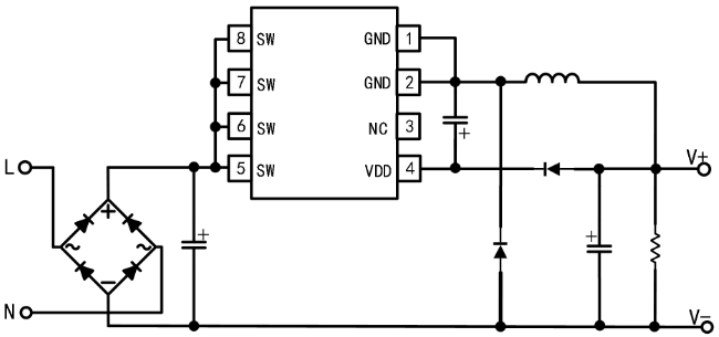 芯片內部集成了高壓啟動電路、電流采樣電路和電壓反饋回路,無需外部啟動電阻、電流采樣電阻和電壓采樣電阻,進一步降低了系統(tǒng)成本和體積。