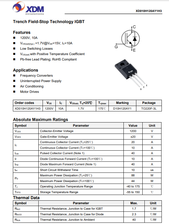 XD010H120AY1H3 國產(chǎn)IBGT 芯達茂 10A 1200V TO-220F-3L